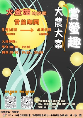 「2025大農大富賞螢趣」活動,有專業導覽解說,還有免費的在地特色伴手禮、開幕市集及草地音樂演出,多樣性的活動就是要讓民眾能夠好好體驗縱谷森林生態與在地之美。歡迎大家入園欣賞螢光之美,一同透過解說,來欣賞全國『最早』、面積『最大』、『最容易』到達的賞螢境地。